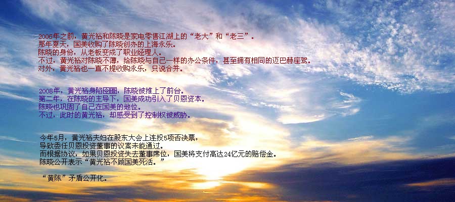 18日,黃光裕方面突然發(fā)布了國美大股東致全體員工的一封信。在這封名為《為了我們國美更好的明天》的信中,黃氏以“疾風(fēng)知?jiǎng)挪荩ky顯忠誠”等言語,大打悲情牌,并措辭激烈地對(duì)國美董事局主席陳曉進(jìn)行了批判,歷數(shù)了陳曉的三大罪狀。