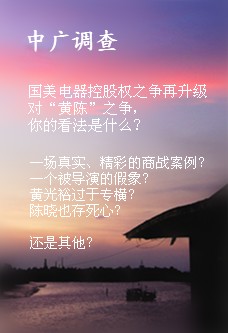而這兩者都將對(duì)國美的市場(chǎng)經(jīng)營極為不利,其導(dǎo)致的不僅將是黃與陳的俱傷,更是國美電器的最大不幸!或者我們想象力更豐富一下,面對(duì)電器商場(chǎng)門店式經(jīng)營的困局,這又會(huì)不會(huì)是被導(dǎo)演的一場(chǎng)騙局呢? |