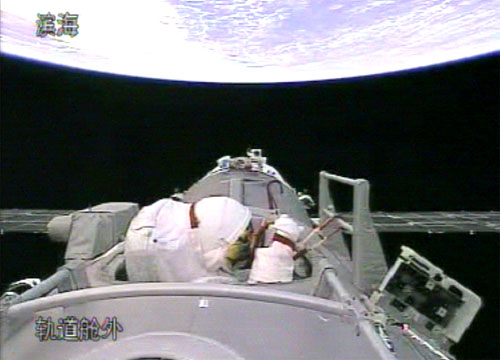 翟志剛以先頭后腳的方式只身進(jìn)入太空,中國人的第一次太空行走開始了。