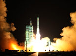 搭載著神舟七號載人飛船的長征二號F遙七運載火箭尾部噴出瑰麗的火焰(記者南光 曹囡囡 攝)