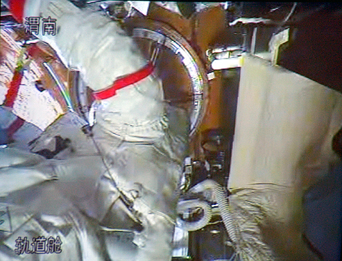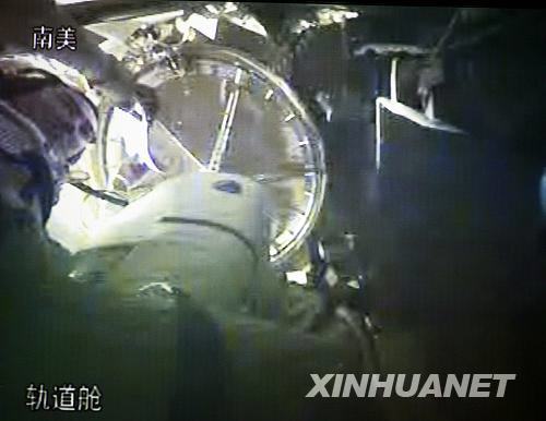 9月27日,航天員翟志剛在神舟七號(hào)載人飛船軌道艙進(jìn)行出艙前的準(zhǔn)備工作(攝于北京航天飛行控制中心大屏幕)。當(dāng)日中午,航天員出艙活動(dòng)任務(wù)開(kāi)始。新華社 查春明 攝