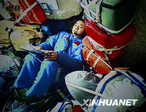 9月27日,航天員景海鵬在神舟七號(hào)載人飛船返回艙與地面通話(攝于北京航天飛行控制中心大屏幕)。當(dāng)日中午,航天員出艙活動(dòng)任務(wù)開(kāi)始。新華社 查春明 攝
