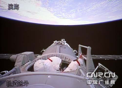 9月27日,航天員翟志剛正在出艙。(中廣網(wǎng)記者南光 曹囡囡攝)