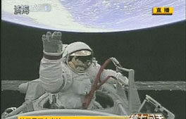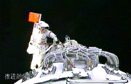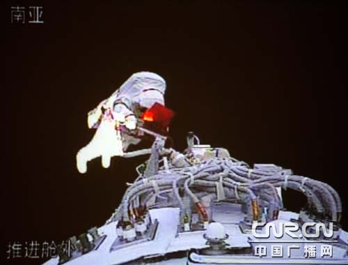 航天員翟志剛揮動著五星紅旗漂浮在太空。(中廣網(wǎng)記者南光 曹囡囡攝)