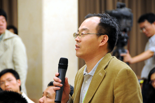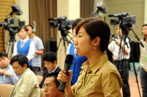 2008年9月27日(星期六)晚8時30分,國務(wù)院新聞辦公室舉行發(fā)布會。請中國載人航天工程辦公室副主任、載人航天工程新聞發(fā)言人王兆耀介紹神舟七號飛船運行、航天員出艙活動等情況,并答記者問。圖為人民日報記者提問。新華網(wǎng) 王翰林 攝