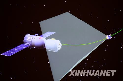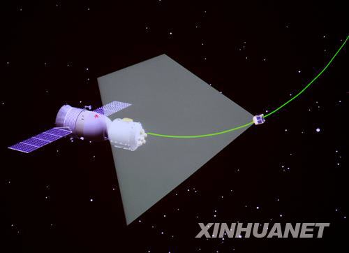 9月27日,在完成航天員出艙任務后,神舟七號飛船在太空釋放一顆伴飛小衛(wèi)星(攝于北京航天飛行控制中心大屏幕)。新華社記者查春明攝