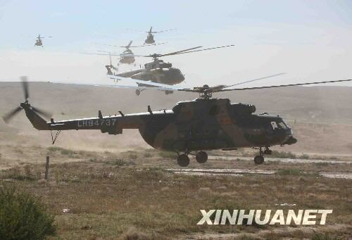 9月26日,在內(nèi)蒙古四子王旗神舟七號(hào)飛船主著陸場(chǎng),空中搜救分隊(duì)的直升機(jī)轉(zhuǎn)場(chǎng)至回收任務(wù)待命區(qū)。 新華社記者 王建民攝