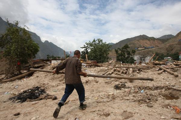 8月19日,一位居民在廢墟上整理已經(jīng)損毀的家。月圓村,一個美麗的名字,甘肅甘南藏族自治州舟曲縣白龍江畔一個祥和的村莊。 僅僅一夜之間,“圓月”變成了一彎殘月。 8月8日發(fā)生的特大山洪泥石流,幾乎給這個村莊帶來了滅頂之災(zāi),全村200多戶居民、700多人所剩無幾。災(zāi)難也讓全世界的目光聚集到這里,讓人們記住了這個美麗又悲傷的名字。初來舟曲的人已經(jīng)無法想象月圓村原本的樣子,數(shù)米厚的泥石把村莊徹底摧毀、掩埋。幸存的村民也只能憑借記憶尋找“家”曾經(jīng)的位置。因為害怕受泥石流沖擊后的房子發(fā)生危險,更擔(dān)心再次發(fā)生洪水,村民有的前往外地投靠親友,大部分則住到了隍廟山上的受災(zāi)群眾安置點。一頂頂藍色的救災(zāi)帳篷,就是他們臨時的家。經(jīng)常有安置點的群眾站在山頂?shù)膸づ襁,久久地凝望祖祖輩輩生活的村莊。從安置點的山上望去,泥石流核心區(qū)域邊上狹窄的一排房子就是留存下來的月圓村。74歲的尚大爺一家就住在這里,他家因為地勢較高,沒有受到損傷。孫子去救災(zāi)了,在他的帳篷里,記者為留在家里的人拍了張合影。在這個名叫月圓的村子里,能拍張全家福的家庭,已經(jīng)寥寥可數(shù)了。更多的人曾經(jīng)或者正在泥石覆蓋的村莊尋找親人。泥石流經(jīng)過后地面稀溏,常常一腳踩下去,深可沒膝。何坤曾經(jīng)跟著姑姑、跟著外公,憑著記憶在黃泥石中尋找遇難的9位家人。因為去了外公家,這個16歲的男孩逃過一劫。親人的遺體找到后,何坤前往受災(zāi)群眾安置點做了一名志愿者,他說這樣做是為了幫助別人,也為減輕自己的痛苦。災(zāi)難過去10余天了,受災(zāi)群眾的日常生活正在一點點恢復(fù)。人們開始往山上運送發(fā)電機;受沖擊較輕的村民忙著整理家園;安置點的帳篷外,孩子們玩起了跳皮筋…… 曾經(jīng)的月圓村找不到了。不見了溪邊村落的流水潺潺,濃蔭匝地。最終的災(zāi)后重建方案尚未公布,如果村子整體搬遷,或許連“月圓村”這個名字也會永遠消失。但月圓村會一直在那里。安置點里無憂無慮跳皮筋的孩子就是月圓村,樹影里的蟬鳴就是月圓村,廢墟上果實累累的青蘋樹就是月圓村,村民們堅強不屈重建家園的精神就是月圓村!