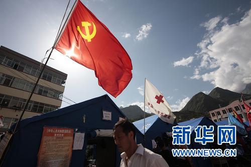 8月19日,在舟曲縣一個(gè)災(zāi)民安置點(diǎn),一面黨旗迎風(fēng)飄揚(yáng)。新華社記者 任正來 攝