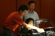 技術(shù)中心周俊生給經(jīng)濟之聲記者黃耀偉戴監(jiān)聽耳機