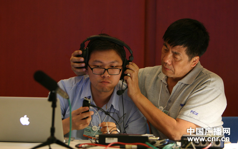 技術(shù)中心周俊生給經(jīng)濟之聲記者黃耀偉戴監(jiān)聽耳機。(中廣網(wǎng)記者 陳曉冉 攝)