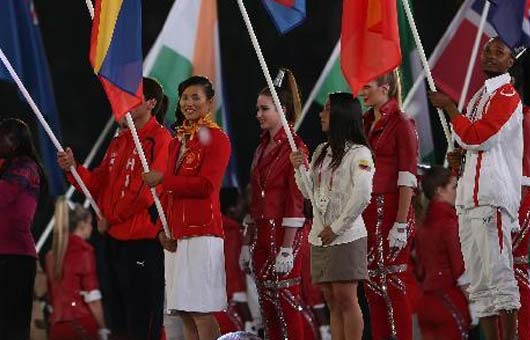 8月12日,第30屆夏季奧林匹克運(yùn)動(dòng)會(huì)閉幕式在倫敦奧林匹克體育場(chǎng)舉行。這是中國(guó)代表團(tuán)旗手、奧運(yùn)會(huì)女子激光雷迪爾級(jí)冠軍徐莉佳(右三)在閉幕式上高舉五星紅旗入場(chǎng)。這是中國(guó)代表團(tuán)旗手、奧運(yùn)會(huì)女子激光雷迪爾級(jí)冠軍徐莉佳(中)在閉幕式上手舉五星紅旗入場(chǎng)。