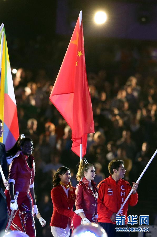 8月12日,第30屆夏季奧林匹克運(yùn)動(dòng)會(huì)閉幕式在倫敦奧林匹克體育場(chǎng)舉行。這是中國代表團(tuán)旗手、奧運(yùn)會(huì)女子激光雷迪爾級(jí)冠軍徐莉佳(右三)在閉幕式上高舉五星紅旗入場(chǎng)。新華社記者凡軍攝