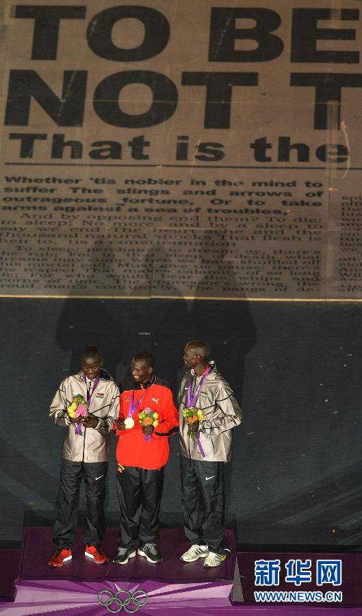 2012年8月12日,第三十屆夏季奧林匹克運動會閉幕式在倫敦奧運會主體育場舉行。圖為閉幕式上舉行的男子馬拉松頒獎儀式。當(dāng)日,在2012倫敦奧運會男子馬拉松比賽中,烏干達選手斯蒂芬·基普羅蒂奇(中)以2小時08分01秒的成績奪冠。 新華社記者 王慶欽 攝