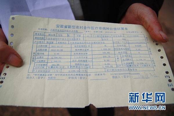 3月28日,安徽省六安市金安區(qū)中店鄉(xiāng)張庵村新華組村民陳宜服向記者展示他住院的醫(yī)療單病種補(bǔ)償結(jié)算單。新華網(wǎng)記者 姜春媛攝