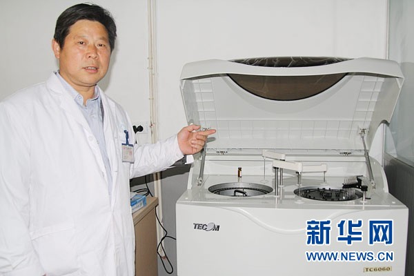 3月28日,安徽省六安市金安區(qū)中店鄉(xiāng)衛(wèi)生院院長潘中香在展示新購置的全自動生化分析儀。他介紹,該設(shè)備可用于血糖、血脂等指標(biāo)的全自動分析。新華網(wǎng)記者 姜春媛攝