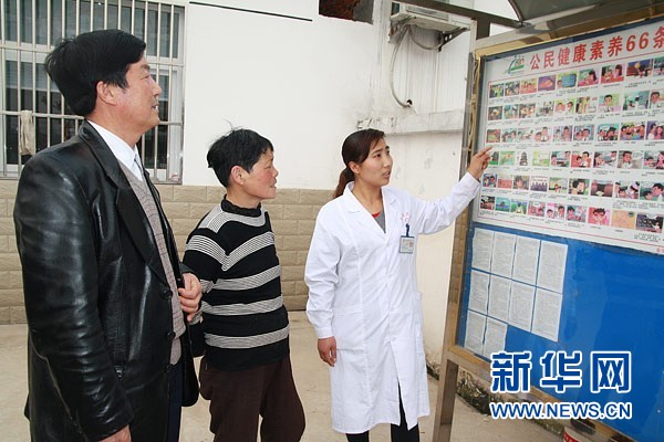 3月28日,村醫(yī)陳緒貴在宣傳欄前為村民詳解健康知識。新華網(wǎng)記者 姜春媛攝