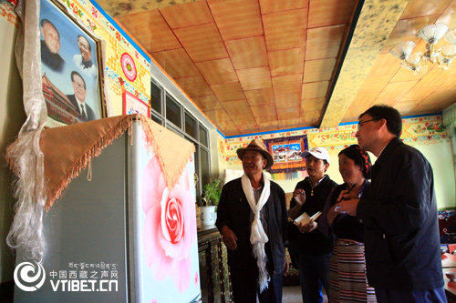 扎桑和旺堆羅布向記者介紹胡錦濤總書記2001年贈(zèng)送給他們的三代領(lǐng)導(dǎo)人畫像。記者 小邊巴/攝