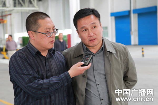 中央臺《傾聽新疆》采訪團(tuán)成員,中央臺記者張雷(左)在陜汽新疆汽車有限公司采訪