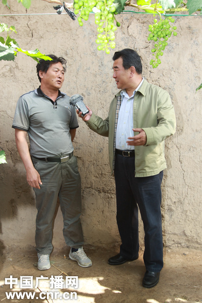 中央臺臺長王求(右)5月12日以普通記者身份參加“傾聽新疆·走轉(zhuǎn)改”采訪活動,圖為記者在榆樹溝鎮(zhèn)林果業(yè)示范基地采訪果農(nóng)孫紅滿