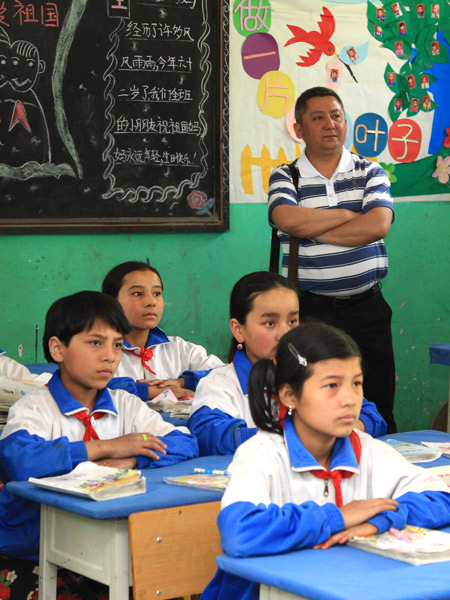新疆民族語言廣播中心主任帕爾哈提·玉素甫在采訪中聽雙語小學(xué)教師講課