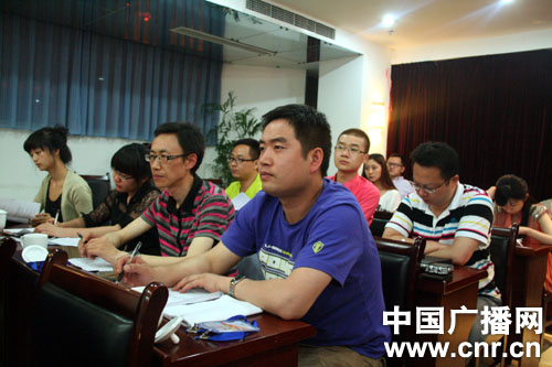 由中國廣播聯(lián)盟組織的“全國百家電臺攜手走轉改:我們在基層”赴四川“走基層、獻愛心”大型采訪活動5月8日在成都市啟動。圖中為各聯(lián)盟臺的記者正在認真聆聽本次采訪活動的主題。中廣網記者李沛 攝