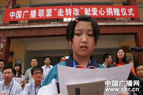 紅星楊小學(xué)學(xué)生代表感謝采訪團(tuán)愛(ài)心捐贈(zèng)(中廣網(wǎng)記者董浩攝)