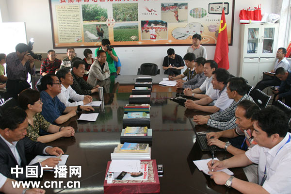 武鄉(xiāng)縣相關(guān)負(fù)責(zé)人在磚壁村向采訪團(tuán)介紹當(dāng)?shù)厍闆r (中廣網(wǎng)記者董浩攝)