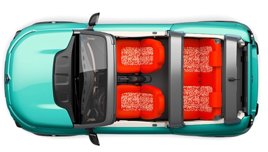 關于內飾方面,雪鐵龍E-MEHARI車內采用四座布局,內飾材質多為塑料與織物,且提供米色與橘紅色兩種內飾配色。另外,其后排座椅可折疊放倒,以擴展儲物空間。