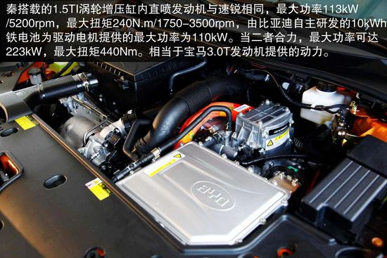 動(dòng)力方面:秦搭載的1.5TI渦輪增壓缸內(nèi)直噴發(fā)動(dòng)機(jī)與速銳相同,最大功率113kW/5200rpm,最大扭矩240N.m/1750-3500rpm,由比亞迪自主研發(fā)的10kWh鐵電池為驅(qū)動(dòng)電機(jī)提供的最大功率為110kW。當(dāng)二者合力,最大功率可達(dá)223kW,最大扭矩440Nm。傳動(dòng)方面,該車匹配的是一臺DCT雙離合變速箱,官方表示該車0-100km/h的加速時(shí)間為5.9秒。