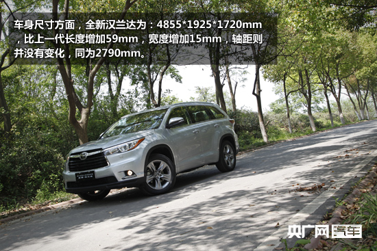 車身尺寸方面,全新漢蘭達為:4855*1925*1720mm,比上一代長度增加59mm,寬度增加15mm,軸距則并沒有變化,同為2790mm。