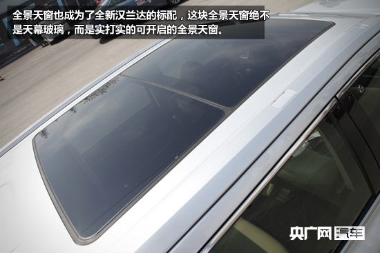 全景天窗也成為了全新漢蘭達的標配,這塊全景天窗絕不是天幕玻璃,而是實打?qū)嵉目砷_啟的全景天窗。