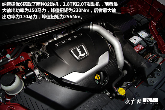 納智捷優(yōu)6搭載了兩種發(fā)動(dòng)機(jī),1.8T和2.0T發(fā)動(dòng)機(jī),前者最大輸出功率為150馬力,峰值扭矩為230Nm,后者最大輸出功率為170馬力,峰值扭矩為256Nm。與之匹配的是來自愛信的6AT變速箱。