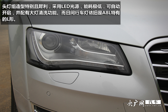 外觀上,前臉部分,一體式進(jìn)氣格柵和盾形中網(wǎng)體現(xiàn)了其奧迪家族的純正血統(tǒng),大量鍍鉻件的加入展露了A8L的高貴氣質(zhì)。頭燈組造型特別且犀利,采用LED光源,能耗極低,可自動(dòng)開啟,并配有大燈清洗功能。而日間行車燈依舊是A8L特有的L形。