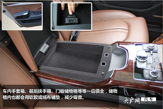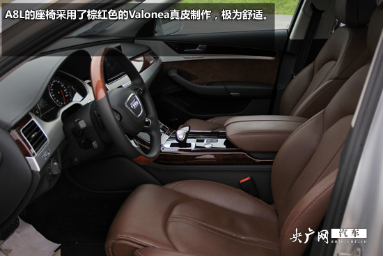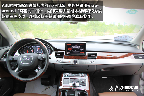 A8L的內(nèi)飾可謂精致典雅,配置高端卻內(nèi)斂而不張揚(yáng)。中控臺(tái)采用wrap-around“環(huán)抱式”設(shè)計(jì),內(nèi)飾采用大量桃木材料和較為柔軟的黑色皮質(zhì),座椅及扶手箱采用的棕紅色真皮搭配,為A8L營(yíng)造出了的極為尊貴卻又不盛氣凌人的駕乘氛圍。
