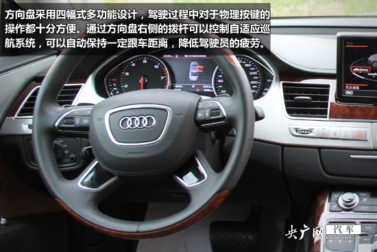 方向盤采用四幅式多功能設(shè)計(jì),駕駛過(guò)程中對(duì)于物理按鍵的操作都十分方便。通過(guò)方向盤右側(cè)的撥桿可以控制自適應(yīng)巡航系統(tǒng),A8L的自適應(yīng)巡航系統(tǒng)作動(dòng)速度區(qū)間是在0-250km/h,可以自動(dòng)保持一定跟車距離,有效降低駕駛員的疲勞。