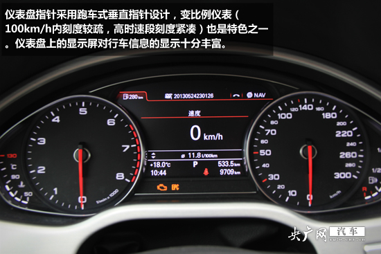 儀表盤指針采用跑車式垂直指針設(shè)計(jì),變比例儀表(100km/h內(nèi)刻度較疏,高時(shí)速段刻度緊湊)也是特色之一。儀表盤上的顯示屏對(duì)行車信息的顯示十分豐富。