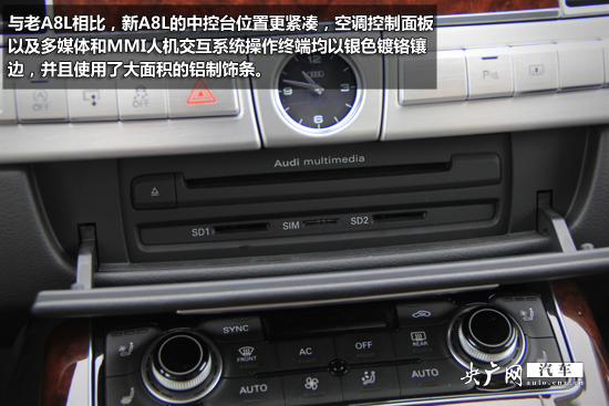 與老A8L相比,新A8L的中控臺(tái)位置更緊湊,空調(diào)控制面板以及多媒體和MMI人機(jī)交互系統(tǒng)操作終端均以銀色鍍鉻鑲邊,并且使用了大面積的鋁制飾條。最新型MMI操作十分方便,駕駛員只需手指在控制板上通過(guò)手寫操作就可以完成指令。而在不需要手寫時(shí),觸摸版上的數(shù)字可以讓駕駛員快速切換收音機(jī)存儲(chǔ)的電臺(tái)頻率。而在需要手寫輸入時(shí),觸摸板上的數(shù)字會(huì)消失,這時(shí)就可以直接在上邊寫字了。中控臺(tái)正中的時(shí)鐘非常精致,實(shí)用度也挺高。
