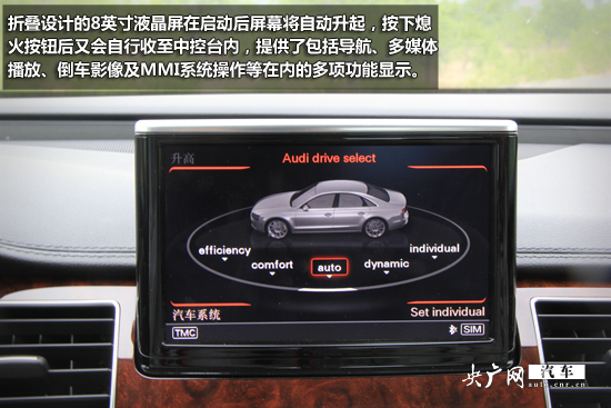 折疊設(shè)計(jì)的8英寸液晶屏在啟動(dòng)后屏幕將自動(dòng)升起,按下熄火按鈕后又會(huì)自行收至中控臺(tái)內(nèi),提供了包括導(dǎo)航、多媒體播放、倒車影像及MMI系統(tǒng)操作等在內(nèi)的多項(xiàng)功能顯示。