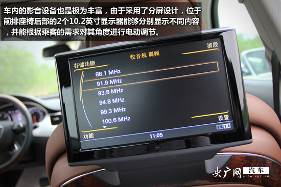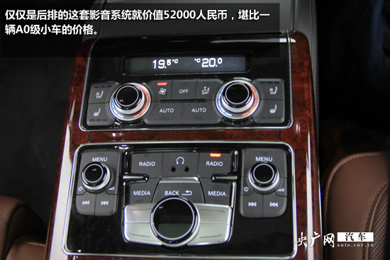 車內(nèi)的影音設(shè)備也是極為豐富,由于采用了分屏設(shè)計(jì),位于前排座椅后部的2個(gè)10.2英寸顯示器能夠分別顯示不同內(nèi)容,并能根據(jù)乘客的需求對(duì)其角度進(jìn)行電動(dòng)調(diào)節(jié),配合兩個(gè)獨(dú)立的耳機(jī)插孔,使后排乘客能互不影響的使用視聽系統(tǒng)。僅僅是后排的這套影音系統(tǒng)就價(jià)值52000人民幣,堪比一輛A0級(jí)小車的價(jià)格。A8L采用Bose環(huán)繞音響系統(tǒng),重低音效果極強(qiáng)。600瓦數(shù)碼功放、14聲道14喇叭、可讓駕乘者盡情沉醉于美妙的音樂聲中。