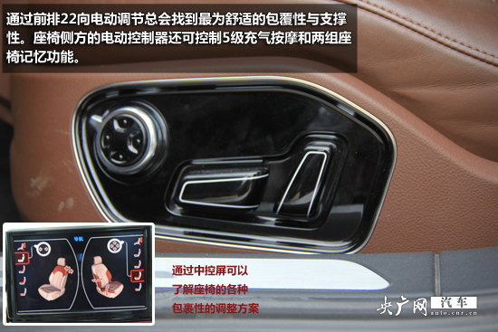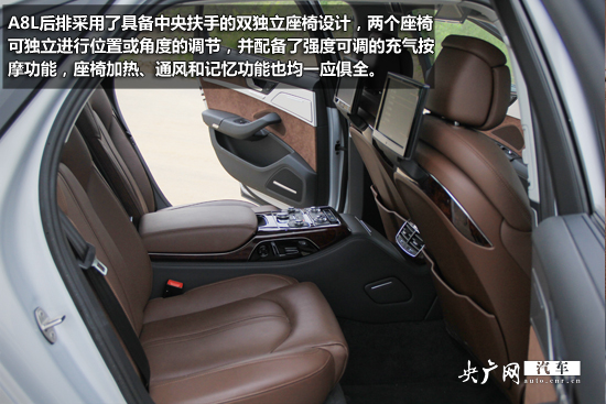A8L的座椅采用了棕紅色的Valonea真皮制作,極為舒適。通過(guò)前排22向電動(dòng)調(diào)節(jié)總會(huì)找到最為舒適的包覆性與支撐性。座椅側(cè)方的電動(dòng)控制器還可控制5級(jí)充氣按摩和兩組座椅記憶功能。同時(shí),通過(guò)中控臺(tái)上的相應(yīng)按鍵也可以開啟座椅通風(fēng)、座椅加熱功能。