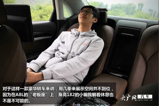 對(duì)于這樣一款豪華轎車來(lái)講,用幾拳來(lái)展示空間并不到位,因?yàn)樵贏8L的“老板座”上,身高182的小編我躺著休息也不是不可能的。雖然這樣的表現(xiàn)與同級(jí)別的其它競(jìng)爭(zhēng)對(duì)手相較沒有突出優(yōu)勢(shì),但足以令苛刻的老板們滿意了。