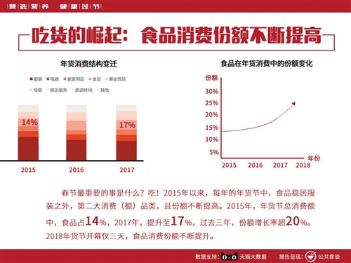 據(jù)科信食品與營(yíng)養(yǎng)信息交流中心副主任鐘凱介紹,2015年至2018年天貓年貨節(jié)大數(shù)據(jù)顯示,公眾在線采購(gòu)的食品類消費(fèi)額占比不斷提升,且食物種類也日趨多樣化。