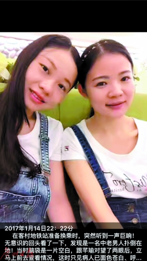 當(dāng)日22時20分,廣東省第二人民醫(yī)院急診科護(hù)士唐翌葵和心內(nèi)三科護(hù)士閔芊瑜正從3號線往8號線換乘。正當(dāng)她們要上扶梯時,10多米開外一名中年男子突然倒下。唐翌葵、閔芊瑜和另外兩名市民趕緊過去幫忙,還有市民去呼叫地鐵工作人員。