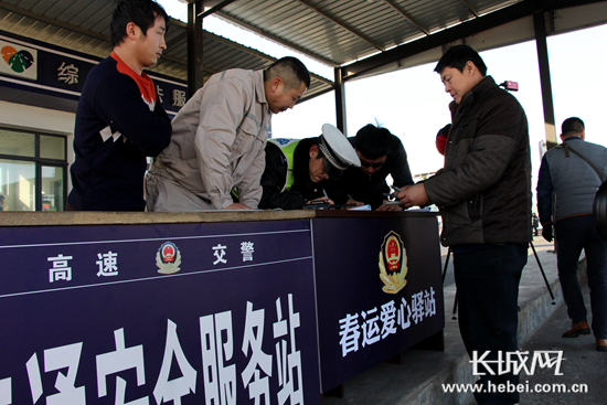 在春運(yùn)交通安全服務(wù)站,民警正在登記檢查。長(zhǎng)城網(wǎng) 高琳哲 攝