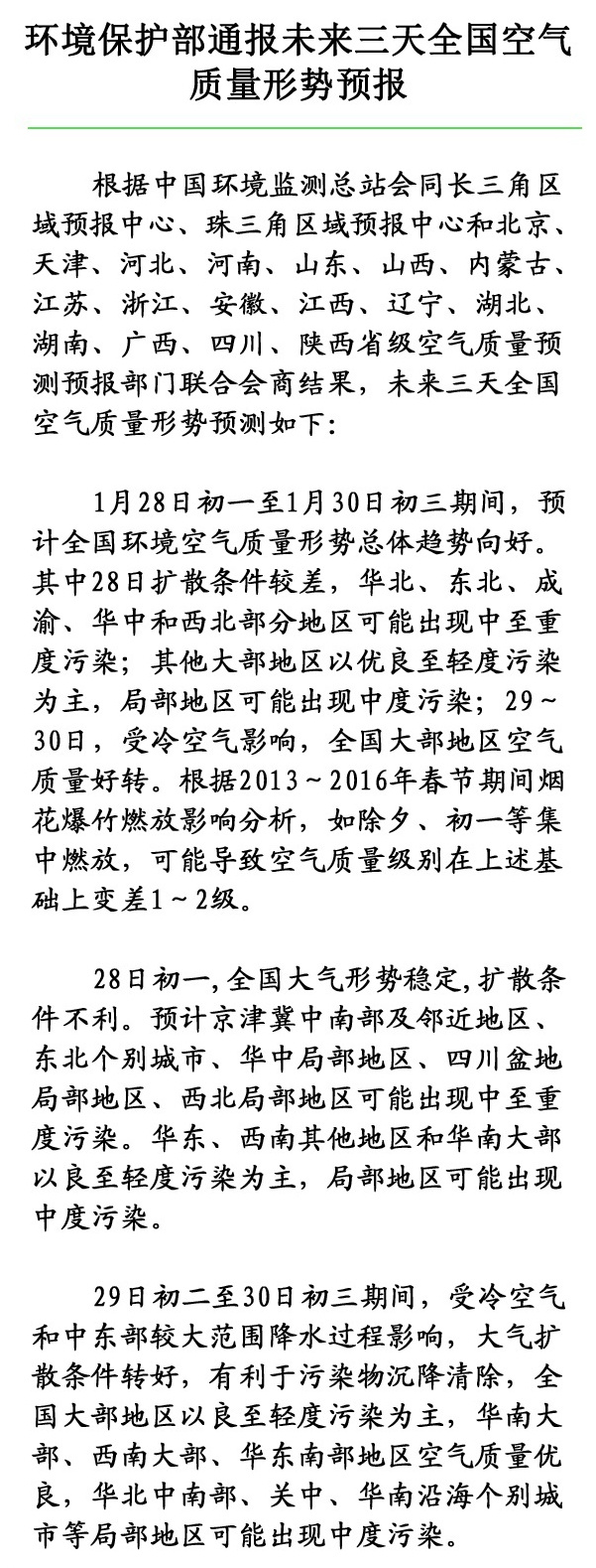 據(jù)環(huán)境保護部宣傳教育司官方微博消息,1月28日初一至1月30日初三期間,預計全國環(huán)境空氣質(zhì)量形勢總體趨勢向好。其中28日擴散條件較差,華北、東北、成渝、華中和西北部分地區(qū)可能出現(xiàn)中至重度污染;29~30日,受冷空氣影響,全國大部地區(qū)空氣質(zhì)量好轉(zhuǎn)。如除夕、初一等集中燃放,可能導致空氣質(zhì)量級別在上述基礎上變差1~2級。