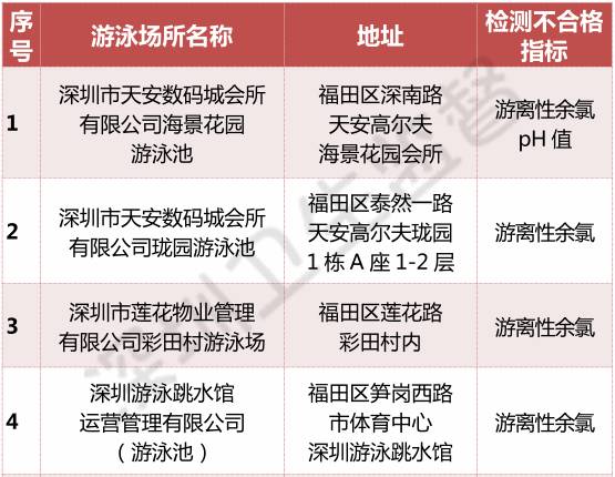 深圳近800家泳池水質(zhì)報告全公開 這57家不合格!,》,全文如下:批游泳場所水質(zhì)抽檢結(jié)果不合格單位 批游泳場所水質(zhì)抽檢結(jié)果不合格單位 批游泳場所水質(zhì)抽檢結(jié)果合格單位