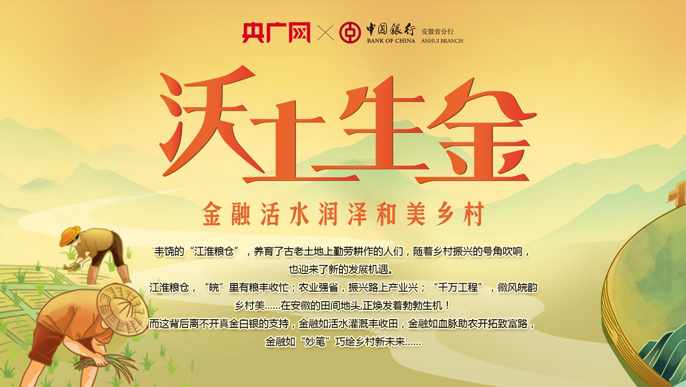 央廣網(wǎng)安徽頻道聯(lián)合中國(guó)銀行安徽省分行推出系列融媒體作品《沃土生金》,帶您探尋皖糧豐收、皖產(chǎn)騰飛、農(nóng)文旅融合、農(nóng)業(yè)科研發(fā)展的故事。