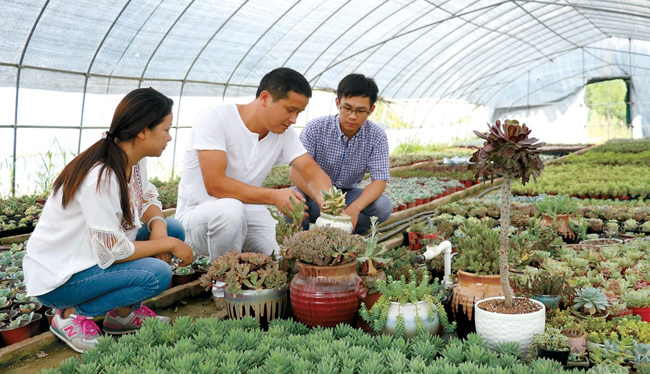 2013年,80后大學生夏云潮和陸立芝夫婦在外打拼多年后,回鄉(xiāng)創(chuàng)辦多肉植物種植公司。他倆投資200萬元、流轉(zhuǎn)20多畝土地,興建2.2萬平方米的溫室連棟大棚種植多肉植物。他們還開了兩家淘寶網(wǎng)店,通過線上線下批發(fā)銷售,年創(chuàng)產(chǎn)值140多萬元,同時帶動當?shù)?00多戶貧困戶創(chuàng)業(yè)就業(yè)。
