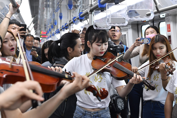 當(dāng)日,在合肥軌道交通2號(hào)線車廂,“好一朵美麗的茉莉花”伴隨著一首清脆小提琴合奏《茉莉花》的音樂聲,一場文化藝術(shù)秀正在精彩上演。